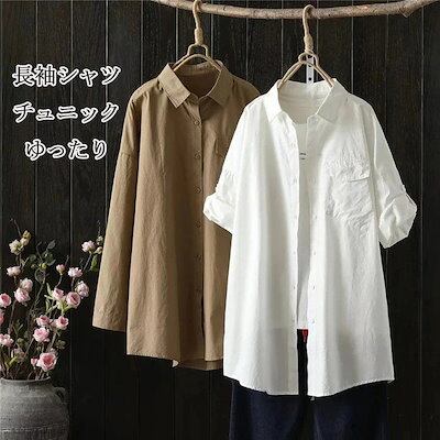 チュニック レディース 綿 長袖 ロングシャツ 折り襟 前開き ボタン 長袖シャツ ポケット付き 無地 コットン 綿混 トップス 羽織り シャツ ゆったり 体型カバー 白シャツ シンプル カジュアル