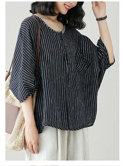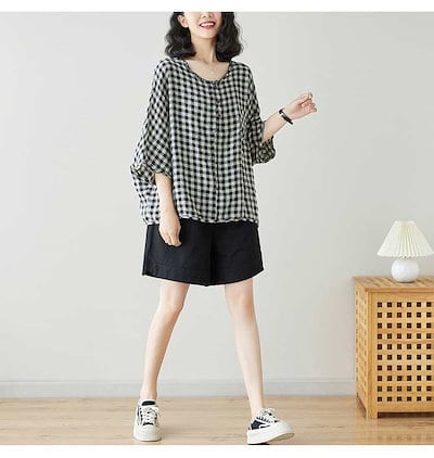 ブラウス チェック ストライプ トップス レディース 綿麻風 シャツブラウス ドルマン ラウンドネック シャツ 前ボタン 前後差 ブラウストップス プルオーバー チェックブラウス フレア 体型カバー