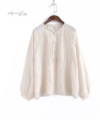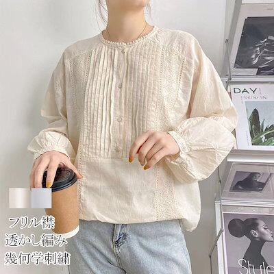 フリル襟 幾何柄 ピンタックブラウス フリルシャツ 刺繍シャツ レディース 透かし編み プルオーバー シャツブラウス 長袖シャツ 春夏 長袖ブラウス 刺繍柄 タック ギャザー ボタン スタンドカラー