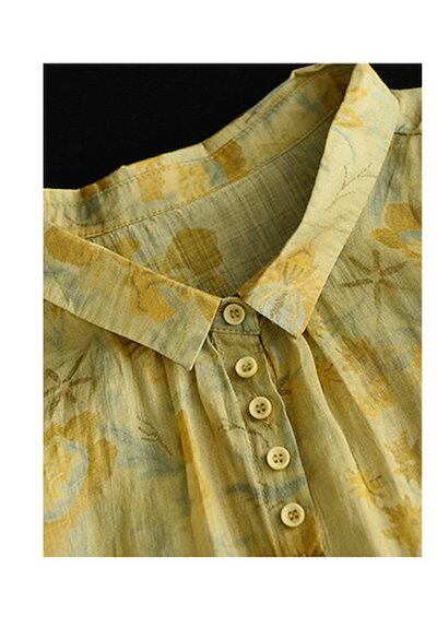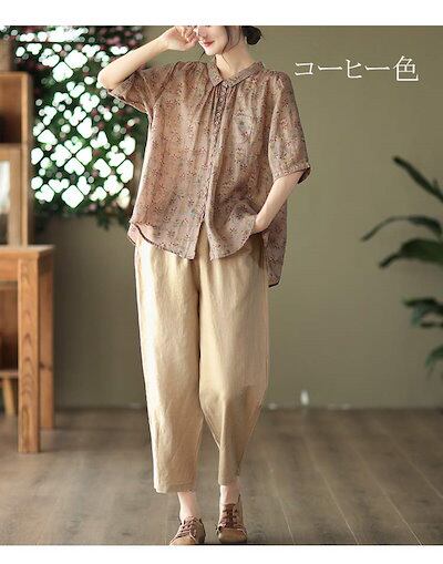 シャツ 半袖 レディース チュニック 花柄 大きいサイズ 体型カバー シャツブラウス 春夏 折り襟 五分袖 夏シャツ 五分袖 開襟 ボタン付き 総柄 トップス 綿麻風 切り替え ポケット 透け感 通気