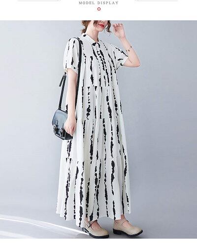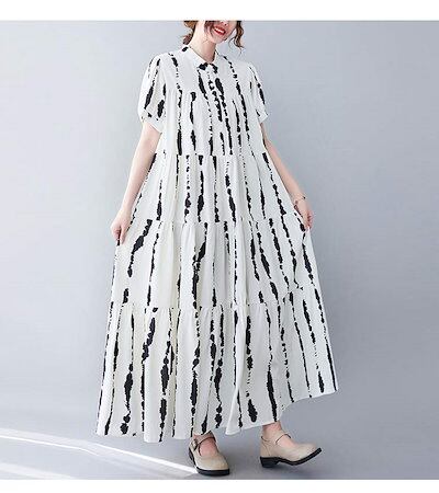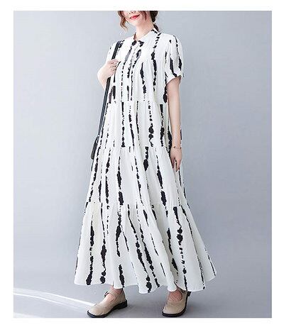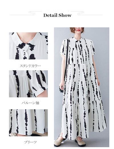 ロングワンピース 半袖 レディース シャツワンピース 大きいサイズ バンドカラー バルーン袖 フレアワンピース マキシ丈 カジュアル 体型カバー 着痩せ プリーツワンピース ボタン付き スタンドカラー