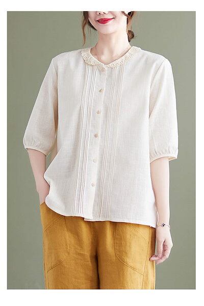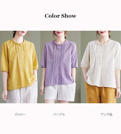 リネン ブラウス レディース 五分袖 麻 シャツブラウス 前開け ボタン止め プリーツ シャツ 折り襟 切り替え レース トップス バルーン袖 花柄 綿麻 体型カバー ゆったり ギャザー オシャレ フ