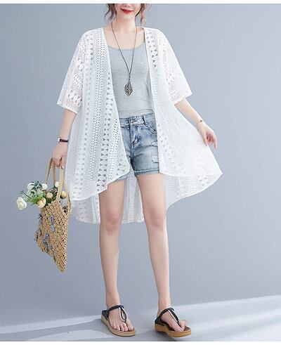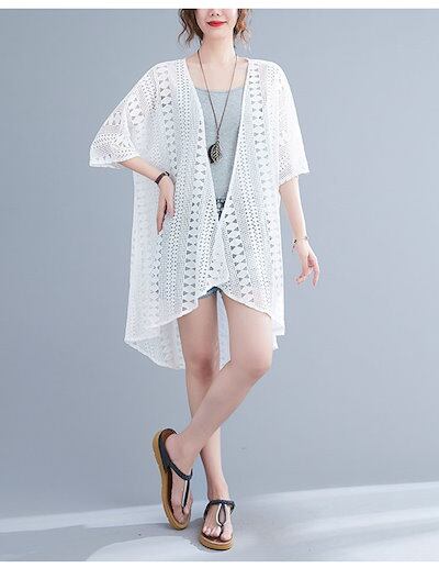 サマーカーディガン レディース サマー レースカーディガン 白 ショール レース カーディガン 透かし編み 羽織り 夏 薄手 アウター ライトアウター 五分袖 ボタンなし トップス ロングカーディガン