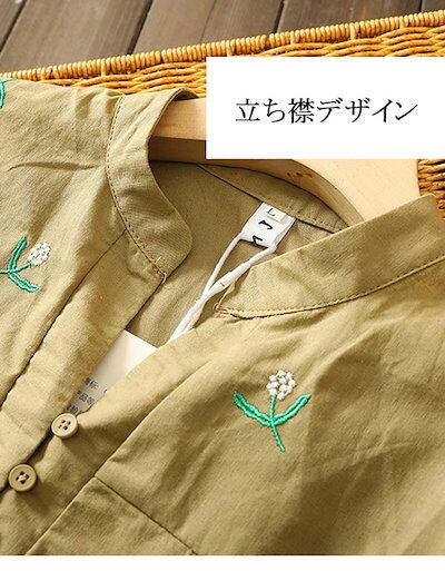 刺繍 リネン シャツ ブラウス レディース 五分袖 シャツブラウス 半袖 花柄 立ち襟 刺繍ブラウス トップス リネン風 スタンドカラー ボタン付き チュニック ピンタック プルオーバー 春夏 おしゃ