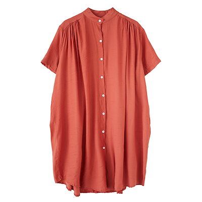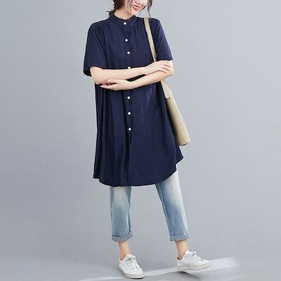 シャツ レディース 夏 トップス 無地 チュニック ボタン止め フレアシルエット ギャザー入り 立ち襟 ゆったり コットン 半袖 着まわし 春 50代 40代 30代 20代-755