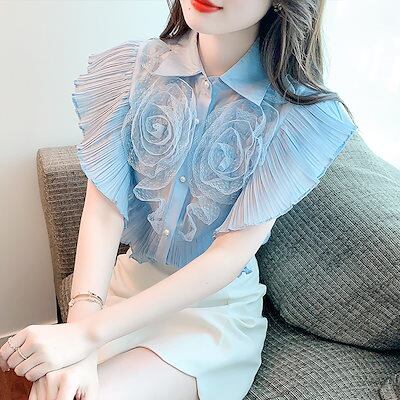 甘レース立体花飾り不規則フリルステッチ単列パールボタン半袖気質シャツレディース