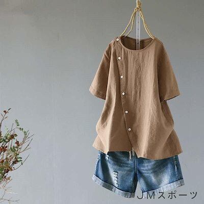 ブラウス シャツ レディース 半袖 ボタン プルオーバー 綿麻混 無地 大きいサイズ ゆったり トップス 夏 ラウンドネック-257