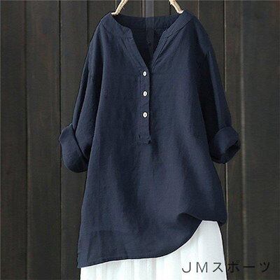 ブラウス レディース トップス シャツ 半袖 夏 綿麻 無地 ボタン付き Vネック 大きいサイズ おしゃれ 20代 30代 チュニック 40代-124