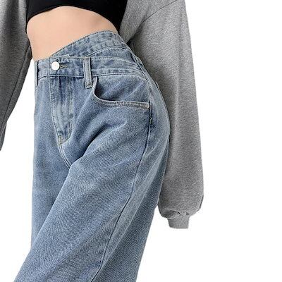 脚長効果デニムパンツ イレギュラーゆったりストレートデニムパンツ レディース百掛けハイウエストスリムワイドパンツ