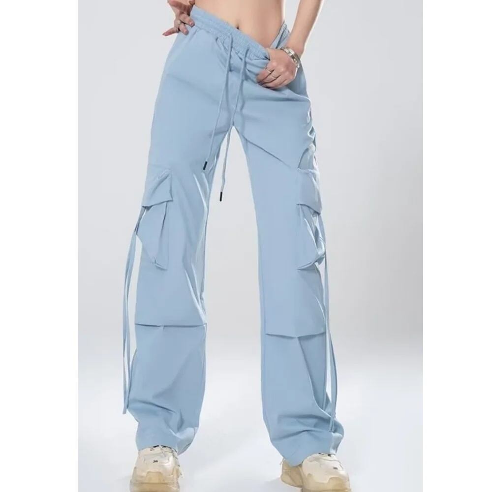 女性のヒップホップカーゴパンツ,カジュアルなストリートウェア,ハイウエスト,大きなポケットのパンツ,ドローストリングのバギー,ワイドレッグ,夏 ボトム ワイドレッグ バギーパンツ T240831222645_05