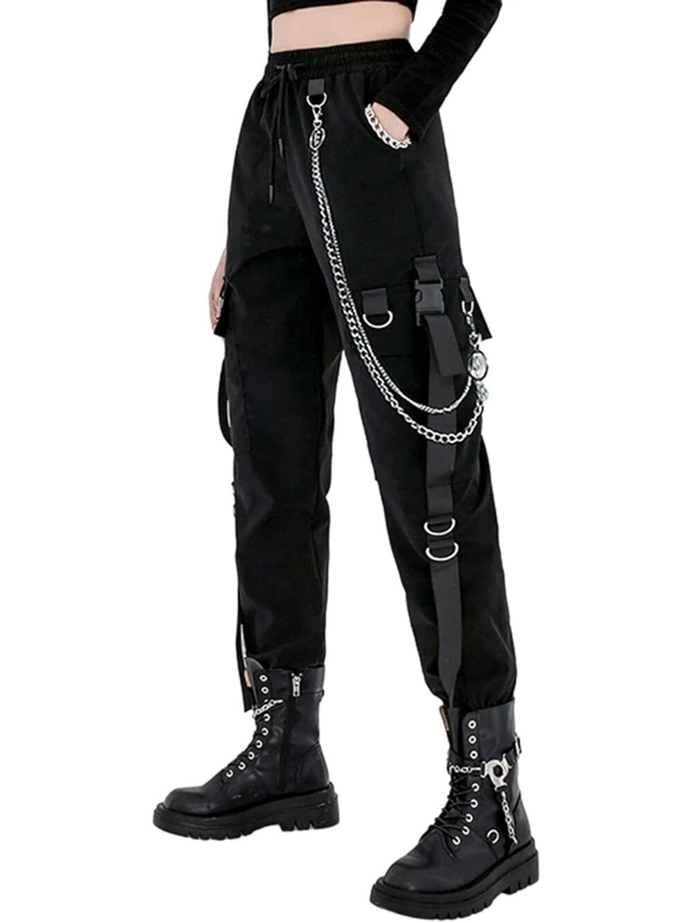 ゆったりとしたカーゴパンツ,チェーン付き,女性用,ジョギング,カジュアル,ヒップホップスタイル,ルーズフィット,ストリートウェア,ロックスタイル ボトム ワイドレッグ バギーパンツ T240831222704_01