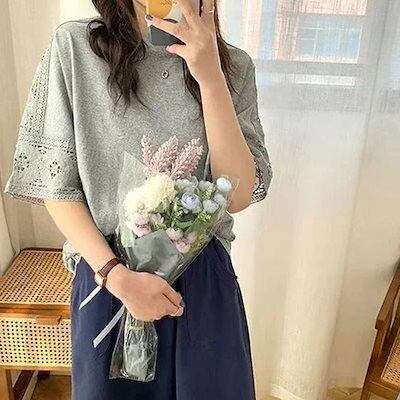 使える!シフォンブラウス Tシャツ 刺繍 レース 二の腕 カバー トップス 切り替え カットソー 半袖 パンチングレース レディース OL 通勤 韓国ファッション