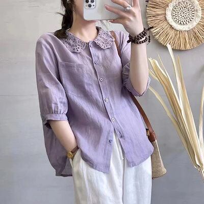 ブラウス レディース 半袖 レトロゆったりレースドールネックリネンシンプル無地半袖ブラウス