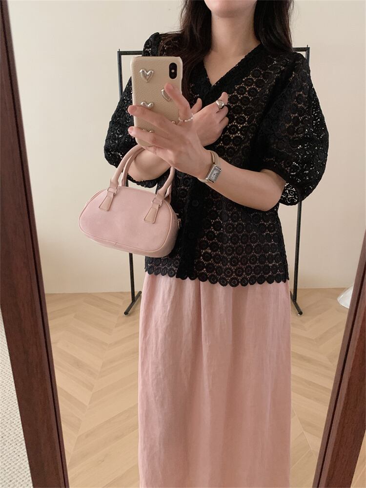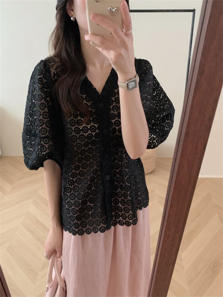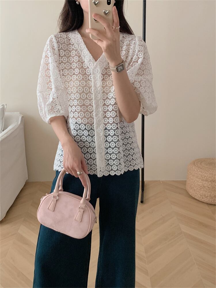 おしゃれの必需品 Vネック パフスリーブ トップス 上着 シャツ レディース 独特 ステンシル レース