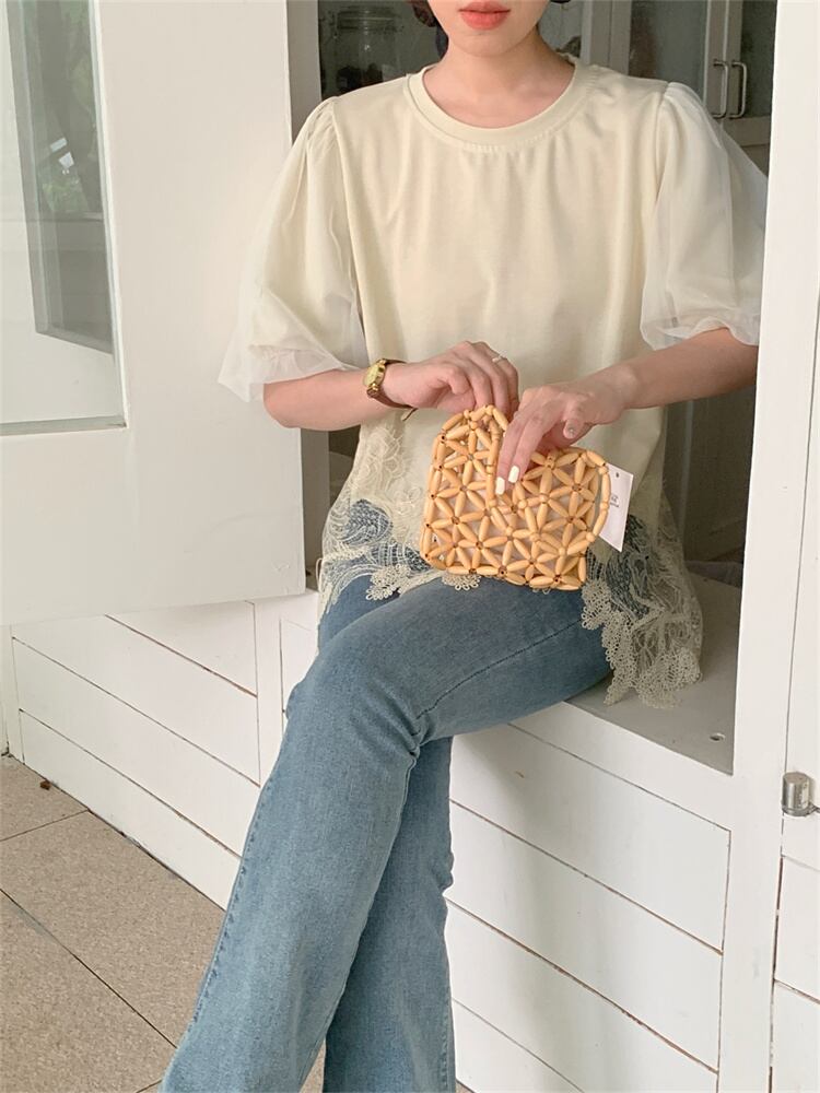 新作限定SALE トップス レース 縫付 レーヨン パフスリーブ Tシャツ 上着 ジェントルスタイル 気質