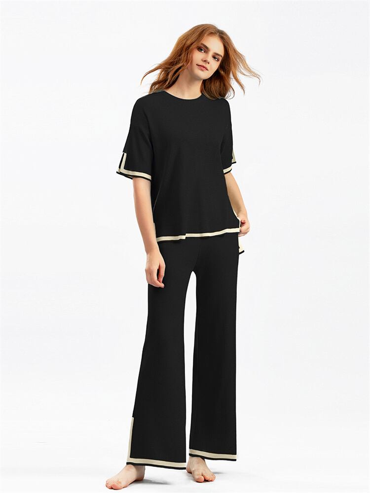 店長推薦 快適である 気質 半袖上着 ニットトップス ハイウエスト ワイドパンツ スラックス 2点セット