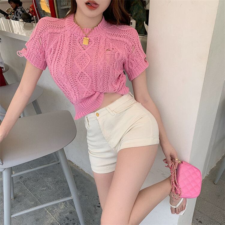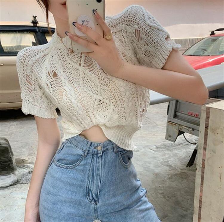 大人の魅力 上品 女性らしい 透かし彫り ホットガールスタイル 半袖 破れ ニットトップス 上着
