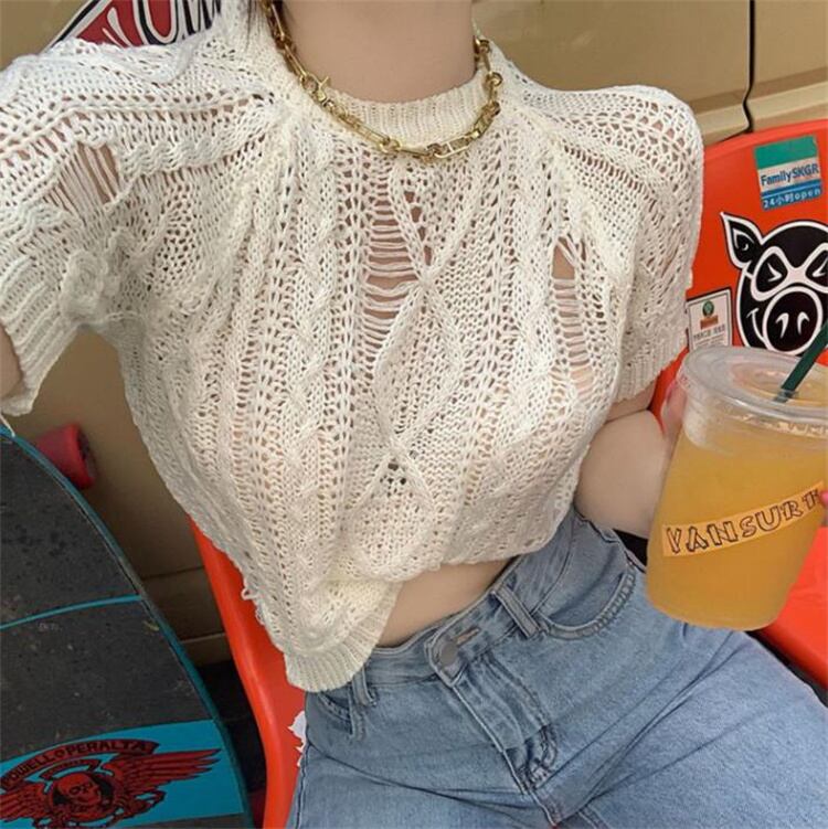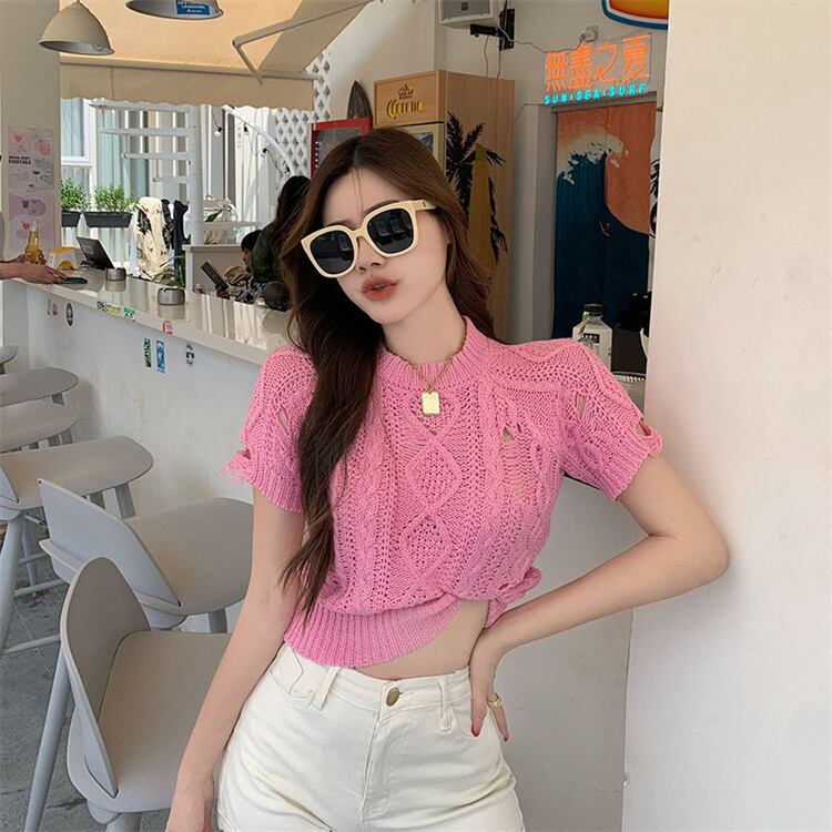 肌触りが好き 早い者勝ち 破れ ニットトップス 透かし彫り 半袖 ジェントルスタイル 上着 新品