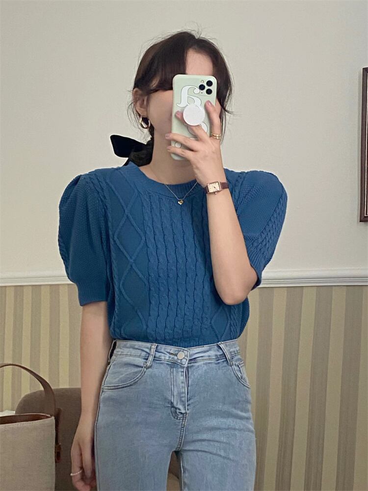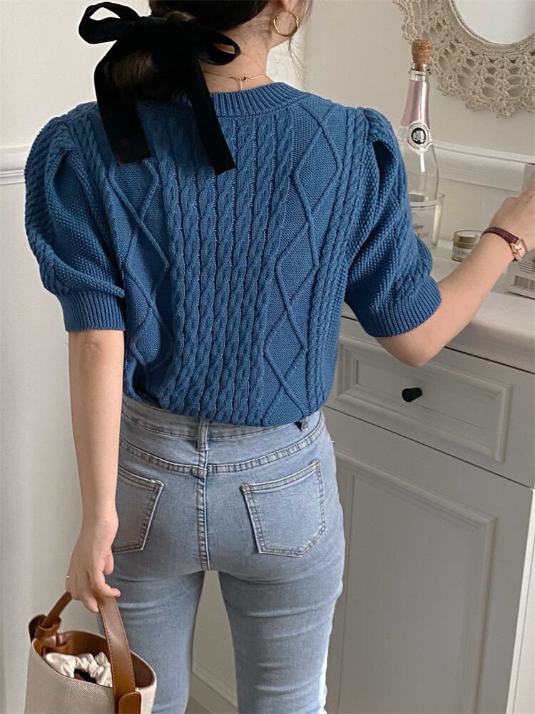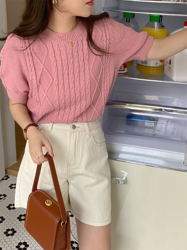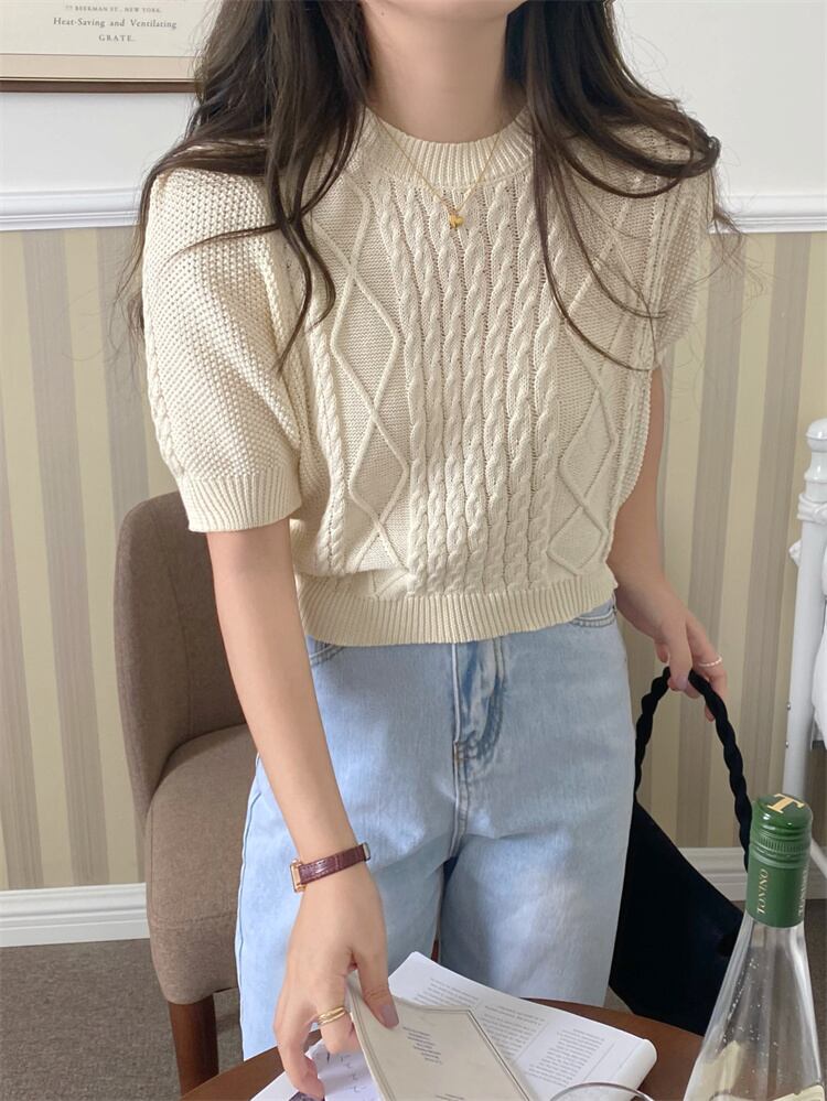 柔らかな雰囲気 短いスタイル 半袖 セーター ニットトップス レトロ ダイヤモンド ツイスト