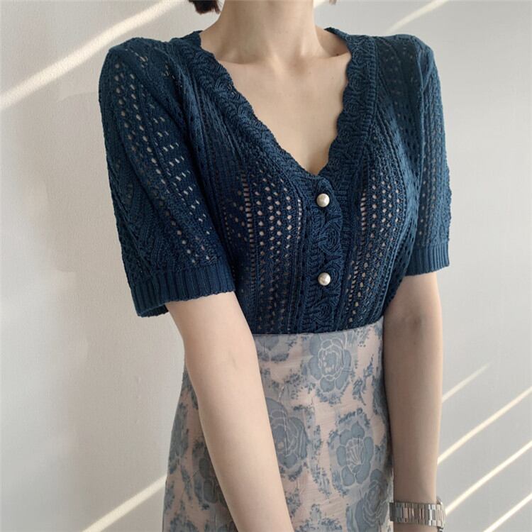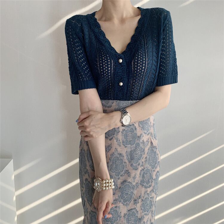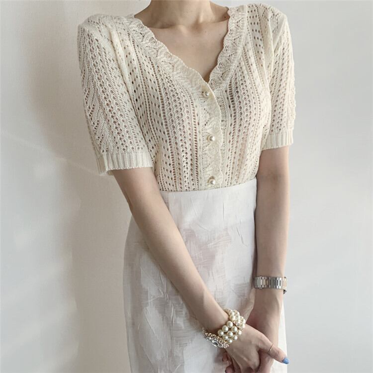 太った女の子に最適 大人気 Vネックパールボタン ゆったりする スリム 透かし彫り 半袖 ニットトップス