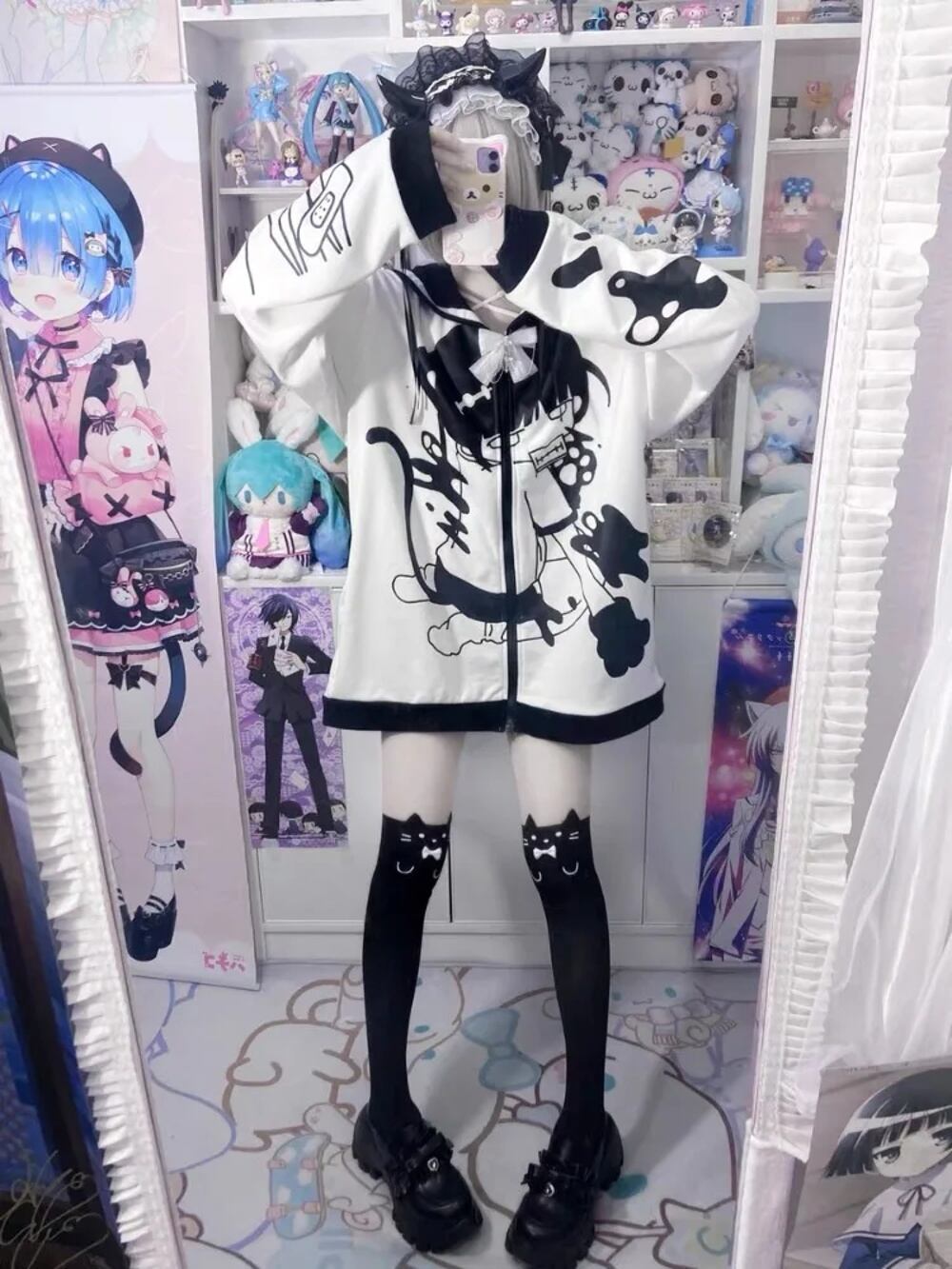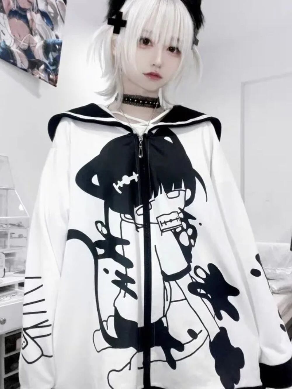 Houzhou-女性の特大のフード付きスウェットシャツ、かわいい漫画のプリント、ジップアップ、ソフトグリール、日本のファッション、原宿、カワイイフーディー、y2k、2023 パーカー ジャージ y2k T240908204307_01