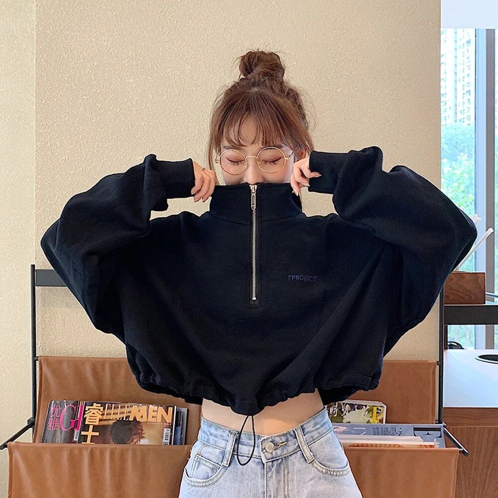 Mexzt-女性用長袖パーカー,原宿,ストリート,ジッパー,黒の長袖,ルーズフィット,シンプル,伸縮性ウエストトップ パーカー ジャージ y2k T240908204510_02