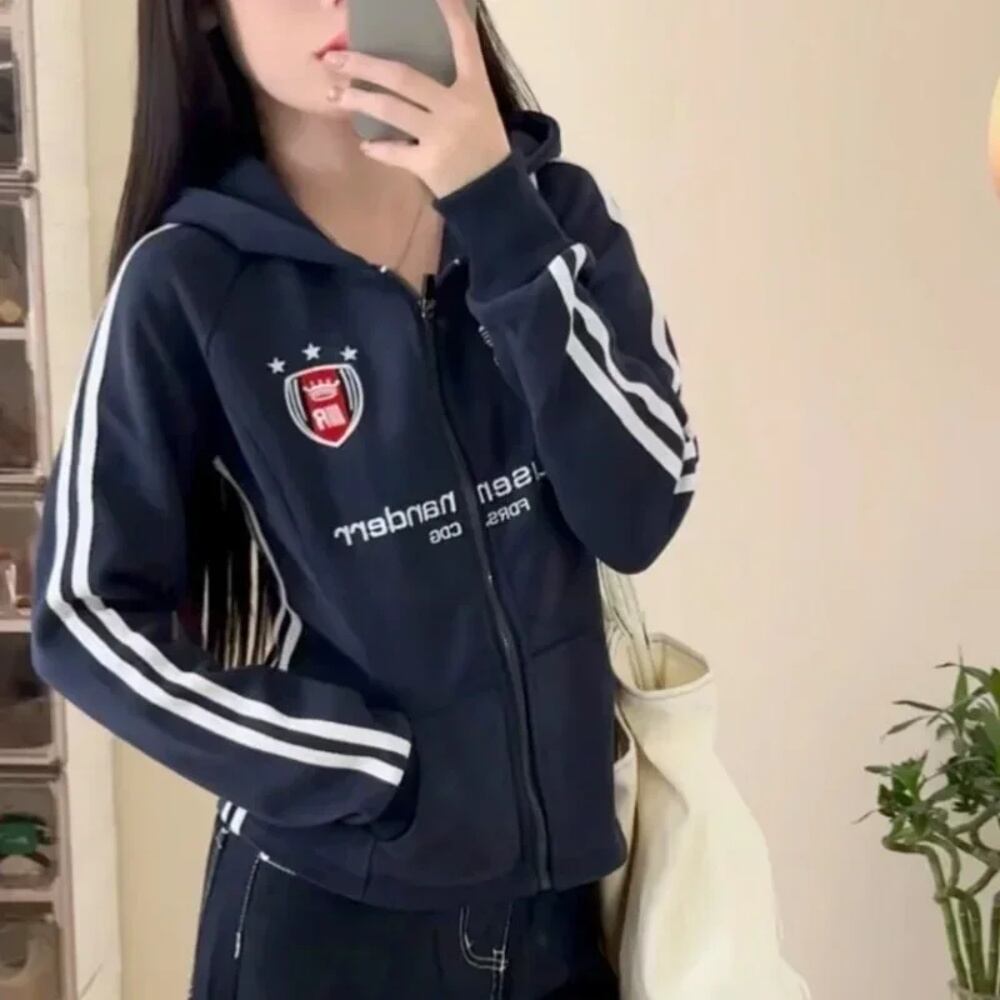 女性のためのレトロなストライプのスウェットシャツ,韓国のパーカー,長袖のトップス,スリムなジッパー,ショートジャケット,甘い大学,カジュアル,y2k パーカー ジャージ y2k T240908204655_01